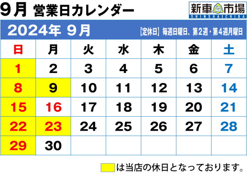 9月の店舗定休日は7・8・14・21・22・28日となります。