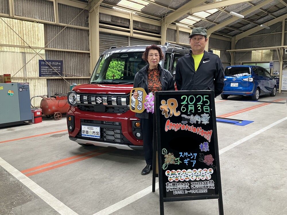 納車式 2025.6.3 ☆ ゚・*:.スペーシアギアご納車おめでとうございます :.*・゚☆ I様ご納車おめでとうございます。カッコイイ車体に赤が映えますね!!装備等で分からない事がございましたらご連絡ください。この度はありがとうございました。